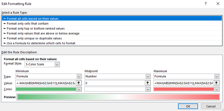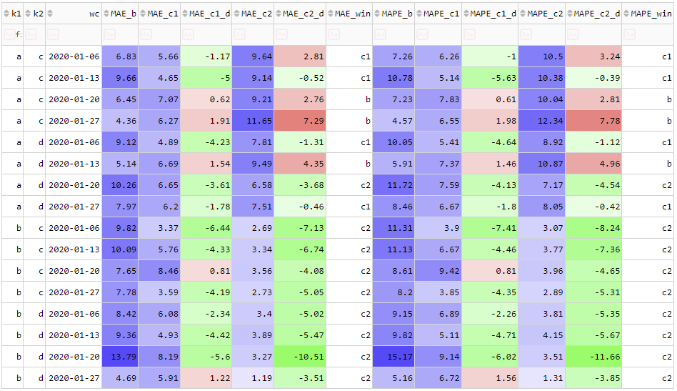 This is fairly obvious, but I have seen it not being followed. To calculate the colour for a specific cell, only a relevant subset of the table (I will call this a subtable) should be used. For example, suppose we are colouring a grid containing both MAE and MAPE values. Depending on the scale of the underlying numbers, the MAEs could be orders of magnitude different from the MAPEs (e.g. for annual sales data, MAEs could be in the 100's or 1000's but the MAPEs could only be up to 20%). For this reason, when calculating the colour for a given MAE cell, it must use only the subtable consisting of the MAE columns and not the entire table. See Figure 4 below