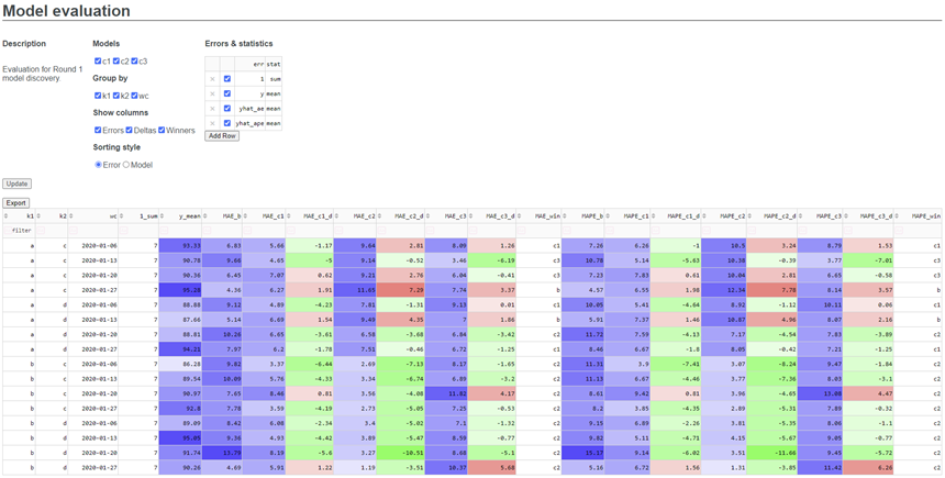This is a simple but important requirement from a UI/UX perspective. With all the grouping columns, models and error metrics mentioned above, the screen real estate is quickly exhausted. The ability to quickly filter out only the relevant information is essential.